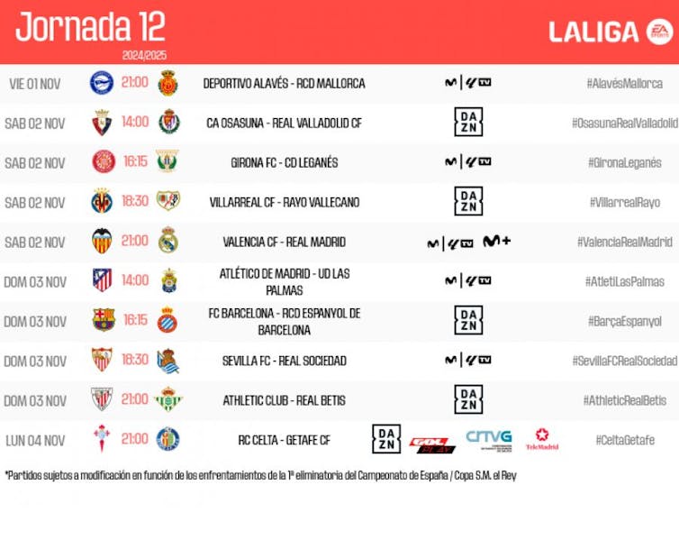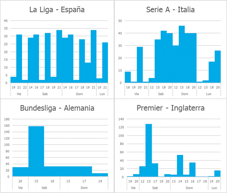 LaLiga española se juega a partes iguales los sábados y domingos a las 14, 16, 18 y 21 horas, y los lunes y viernes en este último horario. La dispersión es muy alta.