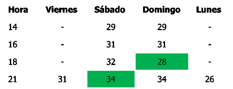 Los números de la tabla que sigue a este párrafo representan los partidos que se jugaron durante la temporada 23/24 de viernes a lunes en la liga española. Para elaborarla, se ha considerado la temporada 23/24 completa y, por simplificar, tan solo se han tenido en cuenta las jornadas de fin de semana, que representan casi el 90 % de los partidos.